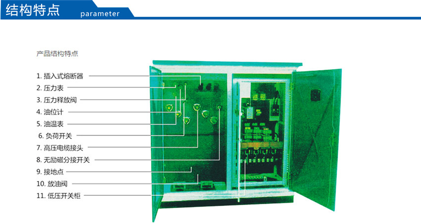 該產(chǎn)品將高壓負(fù)荷開關(guān)、高壓熔斷器置于變壓器油中,具有與變壓器器身共箱或分箱兩種結(jié)構(gòu)形式。油箱采用全密封結(jié)構(gòu),配有油溫表、油位表、壓力表、壓力釋放閥、放油閥等元件以監(jiān)測(cè)變壓器運(yùn)行狀況。該產(chǎn)品分為環(huán)網(wǎng)型、終端型及電源型供電方式。為了使此種產(chǎn)品更適合于我電網(wǎng)的實(shí)際要求,公司又推了插拔型干式熔斷器,熔絲的熔斷不影響變壓器油的性能。根據(jù)低壓饋出要求的復(fù)雜程度,YBM-12/0.4型產(chǎn)品分為標(biāo)準(zhǔn)型、加強(qiáng)型和綜合型三種外殼形式,使用戶和設(shè)計(jì)單位在選型時(shí),做到更靈活、更經(jīng)濟(jì)。